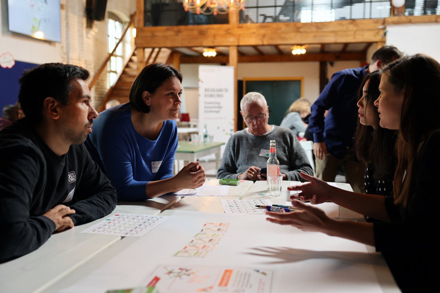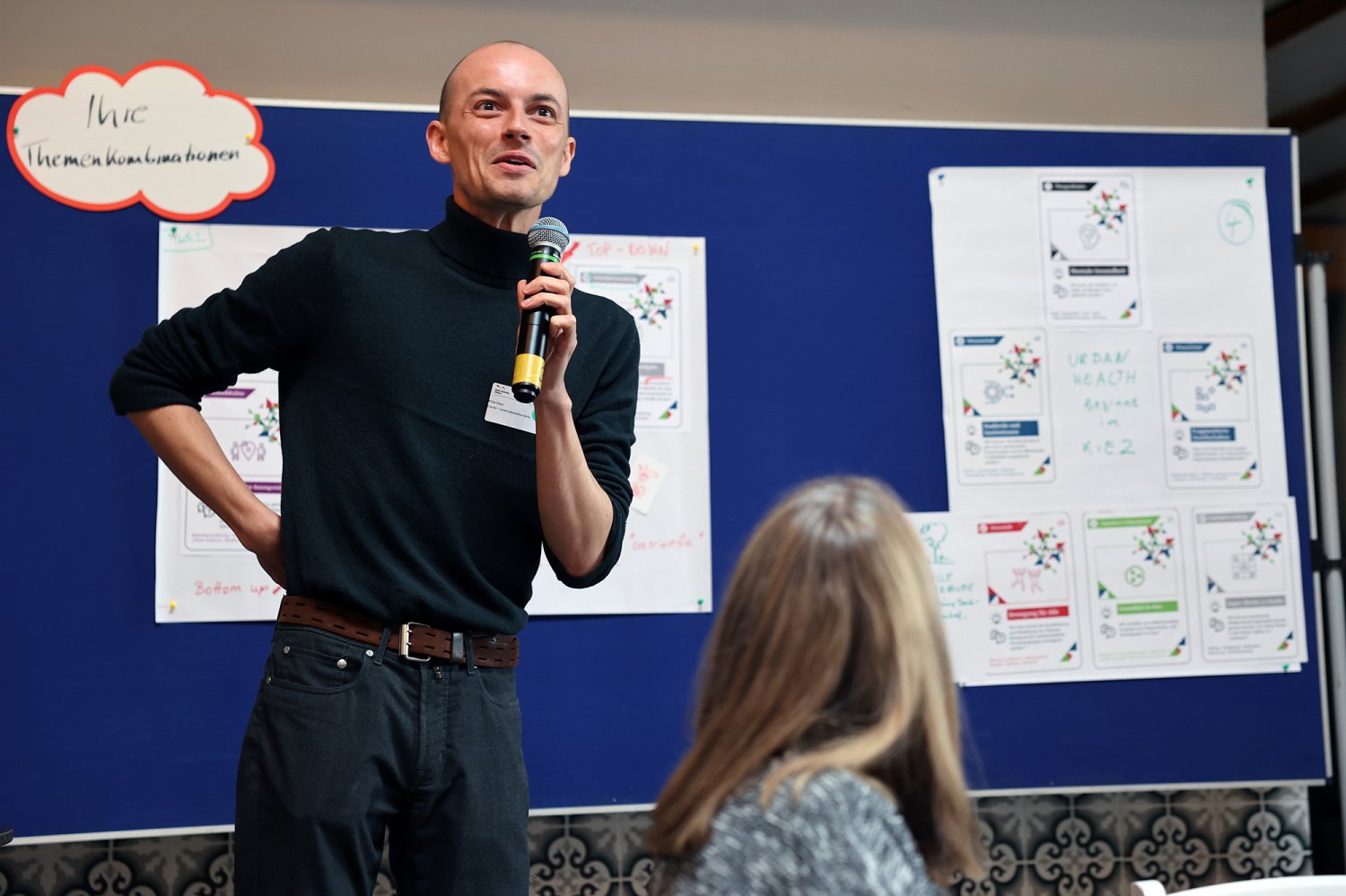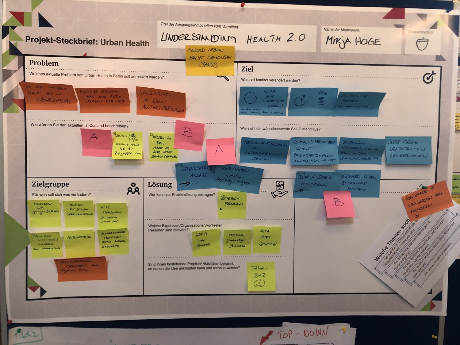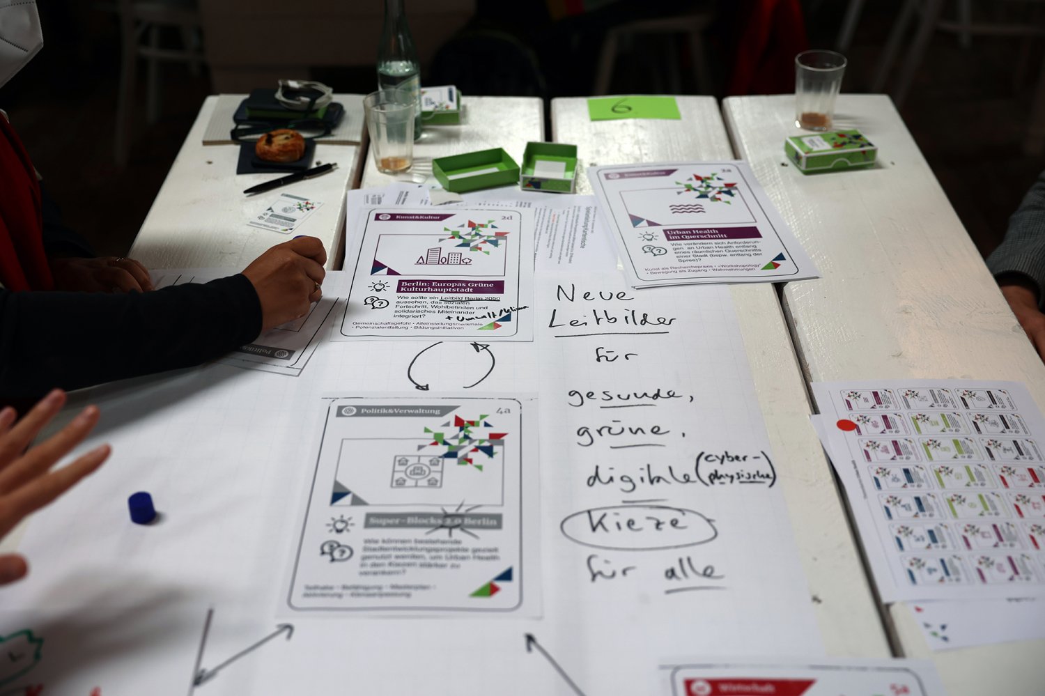 Das Kartenset Urban Health bildete methodisch die Grundlage für den intensiven Wissensaustausch auf dem ‚Markt der Themen‘. Die 52 Teilnehmenden wurden an Kartentischen eingeladen, neue Themenkombinationen zu legen, zu diskutieren und auszuhandeln. Das Spielen, als kreativer Ansatz um zu neuen Perspektiven und Ideen zu gelangen, wurde von den Teilnehmenden äußerst positiv aufgegriffen. Im zweiten Schritt wurden die erarbeiteten Themenkombinationen mittels Projektsteckbriefen geschärft. Mindestens fünf Projektideen werden nun auf dem anstehenden ‚Markt der Partnerschaften‘ am 23. November 2022 vertieft (Phase 4) – mit dem Ziel, konkrete transdisziplinäre Umsetzungsprojekte zu Urban Health in Berlin zu initiieren.