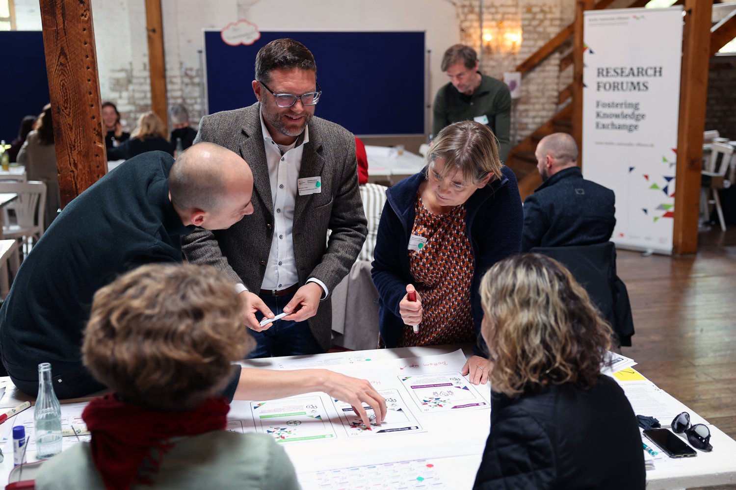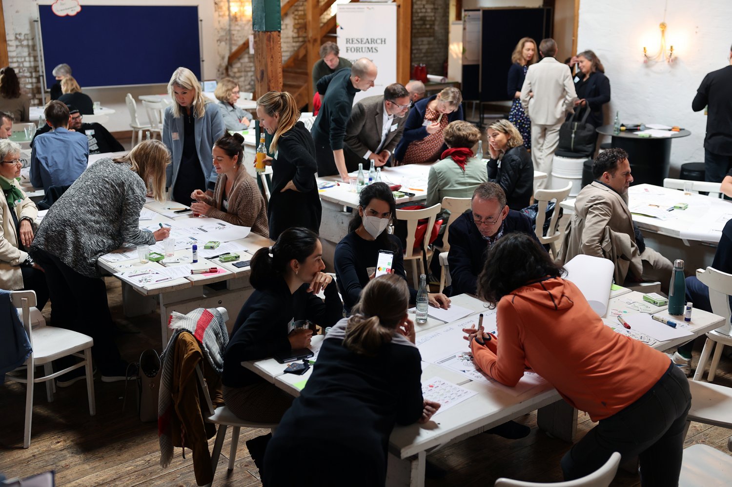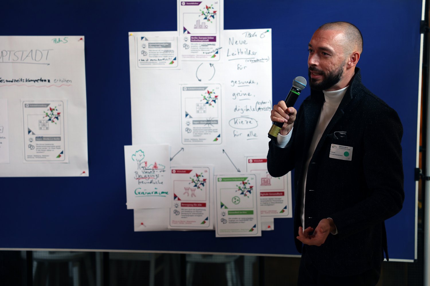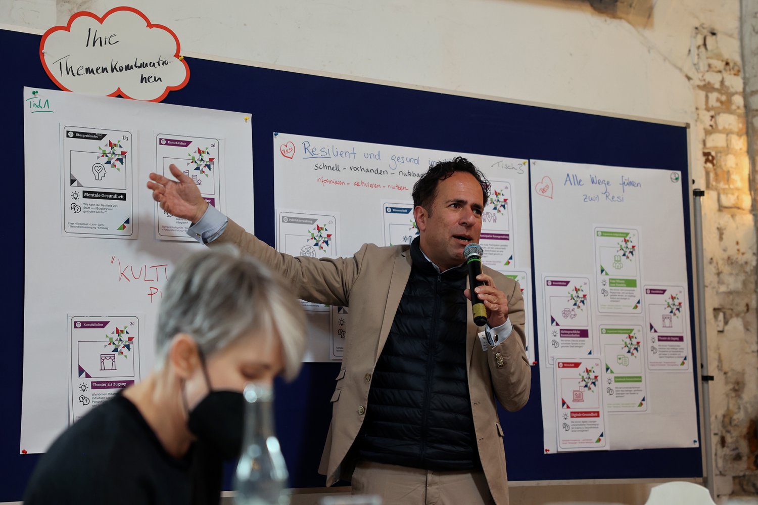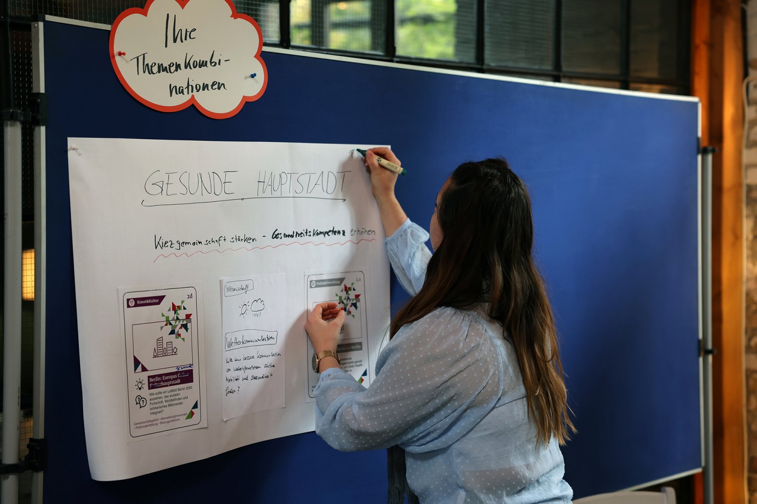 Endlich war es soweit: Nachdem im Juni bereits in fünf Themensprints Vertreter*innen aus den Bereichen Kunst & Kultur, organisierte Zivilgesellschaft, Politik & Verwaltung, Wirtschaft sowie Wissenschaft die aus ihrer jeweils bereichsspezifischen Perspektive drängenden Herausforderungen von Urban Health in Berlin definiert haben, lernten sich am 28. September 2022 alle Vertreter*innen der fünf Bereiche auf dem ‚Markt der Themen‘ kennen. Nicht nur die Teilnehmenden lernten sich kennen – was ein wesentliches Ziel der Themenwerkstätten ist – sondern sie lernten nun auch ihre Ergebnisse aus den jeweiligen Themensprints kennen. Insgesamt 18 Herausforderungen und erste Lösungsansätze für Urban Health in Berlin wurden in den Themensprints formuliert, die in das Kartenset Urban Health mündeten.
